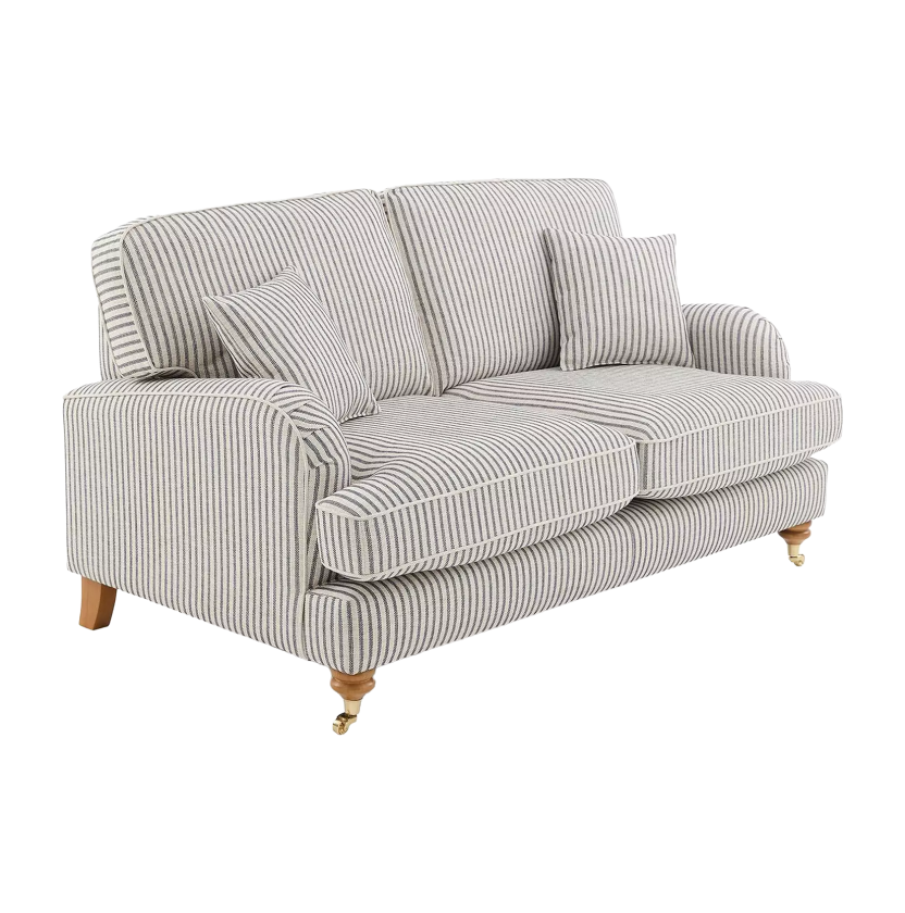 The Padstow masterfully blends traditional English countryside charm with a breezy, coastal aesthetic. Upholstered in a timeless ticking stripe fabric, the vertical pattern provides a crisp, structured look that elongates its classic silhouette, while being brought up to date by the use of soft chenille yarns offering comfort as well as traditional styling. The design features elegant scroll arms, tailored piping for a high quality finish. Every detail, from the neat piped edging to the matching scatter cushions, reflects a commitment to high-quality craftsmanship and enduring style.