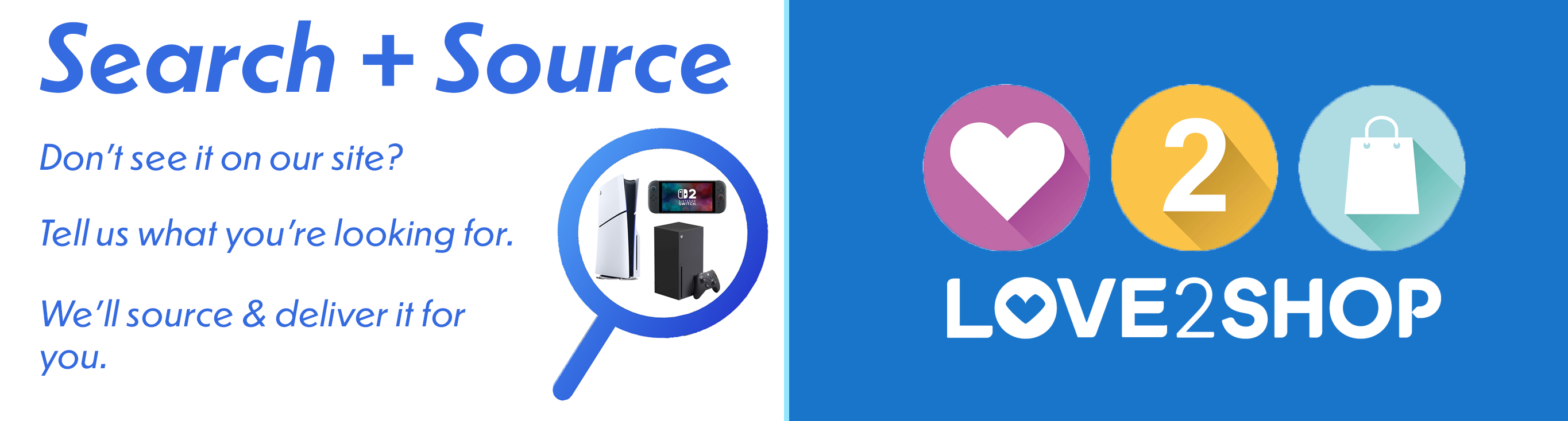 Since we changed our business model in 2025, we went from offering games consoles to providing Love2shop vouchers for our customers to purchase the items they wanted, not just what we had in stock. If you don't see a games console on the website which you need, then why not make the most of our Search and Source service?