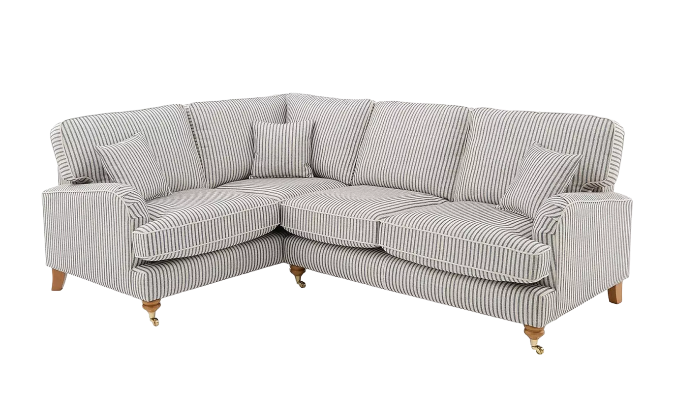 The Padstow masterfully blends traditional English countryside charm with a breezy, coastal aesthetic. Upholstered in a timeless ticking stripe fabric, the vertical pattern provides a crisp, structured look that elongates its classic silhouette, while being brought up to date by the use of soft chenille yarns offering comfort as well as traditional styling. The design features elegant scroll arms, tailored piping for a high quality finish. Every detail, from the neat piped edging to the matching scatter cushions, reflects a commitment to high-quality craftsmanship and enduring style.